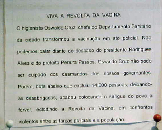 Durante o período da exposição Revolta da Vacina - Cidadania, Ciência e Saúde (1º de setembro a 18 de novembro de 2006) será realizada uma Oficina de Jornal para grupos agendados, que consiste em uma visita guiada por monitores, na qual os visitantes são informados sobre temas ligados à cidade, à sociedade e ao conhecimento científico, em um contexto de Saúde Pública. A partir dessas informações é proposta uma atividade de produção da 1ª página de um jornal na qual os grupos produzem textos e imagens para compor um informativo.
